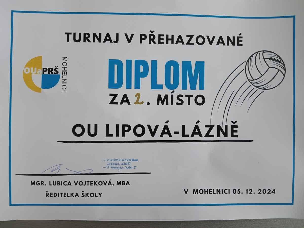 Ve čtvrtek 5. prosince 2024 se v prostorách Odborného učiliště a Praktické školy Mohelnice, uskutečnil turnaj v přehazované. Soutěže se zúčastnilo celkem 7 škol, přičemž naše škola dosáhla vynikajícího výsledku – obsadila krásné 2. místo.Velkého úspěchu dosáhli naši žáci ve složení Daniela, Lenka, Martina, Vendula, Kamil, Martin, Matěj a Patrik, kteří svým týmovým výkonem prokázali odhodlání a sportovní dovednosti.